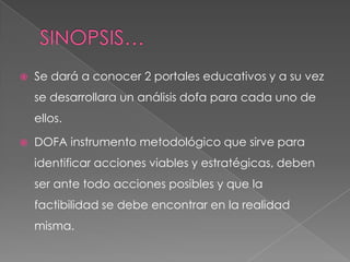 Este documento presenta un análisis DOFA de dos portales educativos utilizando criterios como apariencia, contenido y utilidad. El primer portal, Curiosikid, tiene una apariencia atractiva pero contenido básico solo en español. El segundo portal, e-Ducativa, tiene mucho contenido en dos idiomas pero una apariencia opaca. El resumen concluye que es importante conocer estos y otros portales educativos para complementar el trabajo docente y hacer la educación más dinámica e interactiva mediante el uso de la tecnología.