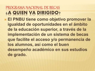 Este documento describe el Programa Nacional de Becas Bicentenario, el cual tiene como objetivo promover la igualdad de oportunidades en la educación superior a través de becas para el acceso y permanencia en carreras de grado de las áreas de salud, humanidades y ciencias sociales. El programa está dirigido a estudiantes ingresantes y avanzados de universidades e institutos nacionales que cumplan con los requisitos de edad, ingresos, nacionalidad y progreso académico. El plazo de inscripción finaliza el 3 de