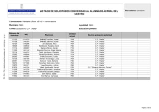 Este documento proporciona una lista de solicitudes de ayuda concedidas a estudiantes actuales de primaria en el Centro Público "Atalía" en Gijón para el año académico 2015-2016. Incluye el nombre, unidad y centro de cada estudiante, así como el número de solicitud. La lista contiene más de 70 nombres de estudiantes.