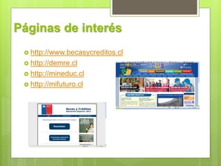 Este documento describe varias becas y créditos disponibles para estudiantes universitarios en Chile, incluyendo la Beca Vocación de Profesor, Beca Puntaje PSU, Beca Excelencia Académica, Beca Bicentenario, Beca Para hijos de profesores, Beca Juan Gómez Milla, Beca Nuevo Milenio, Beca Propedéutico, Beca de mantención para la Educación Superior (BEMES) y Beca de alimentación para la Educación Superior (BAES). Cada beca tiene diferentes características,