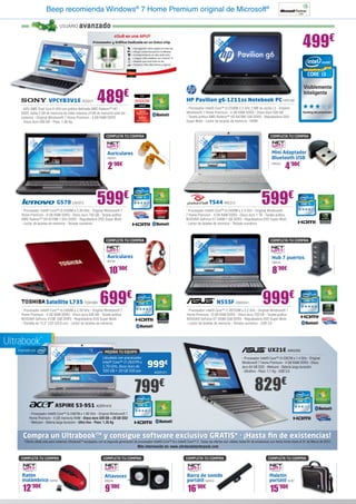 Este documento presenta varios productos electrónicos de la tienda Beep, incluyendo portátiles, libros electrónicos y una promoción de financiación en 10 meses sin intereses. Se destacan dos portátiles HP Pavilion con procesadores Intel Core i3, 4GB de RAM y disco duro de 500GB, uno con gráfica AMD por 489€ y otro por 499€. También se muestran tres modelos de libros electrónicos entre 99'90€ y 129'90€ con pantallas táctiles de diferentes tamaños y especificaciones.