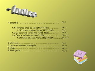 Beethoven nació en 1770 en Alemania y fue un compositor y pianista clásico y romántico. Tuvo una vida difícil marcada por la enfermedad de su madre y el alcoholismo de su padre. A pesar de su prematura sordera, compuso numerosas y exitosas obras como sus 9 sinfonías, 32 sonatas para piano, concierto para piano "Emperador" y la Novena Sinfonía con el Himno a la Alegría. Murió en 1827 en Viena tras una vida dedicada a la música.