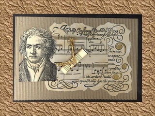 Ludwig van Beethoven nació en Bonn, Alemania en 1770. Desde pequeño mostró interés por la música al venir de una familia de músicos. Aunque se quedó sordo más tarde en su vida, continuó componiendo música incluyendo sonatas, sinfonías y el Himno a la Alegría que fue escogido como himno de Europa. Se le considera el primer artista moderno.