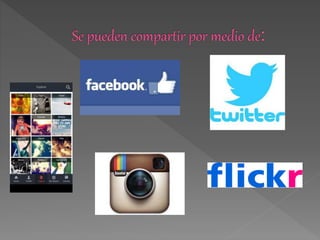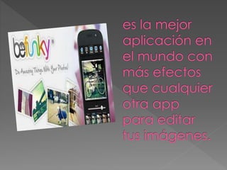 El documento describe una aplicación móvil para editar fotos que ofrece varios efectos como bordes, calcomanías y la capacidad de dividir fotos en cuadros. La aplicación solo se puede usar en dispositivos móviles y podría no ser la versión original. Ofrece una variedad de efectos no disponibles en otras aplicaciones y permite controlar la intensidad de los efectos aplicados o deshacer los cambios realizados.