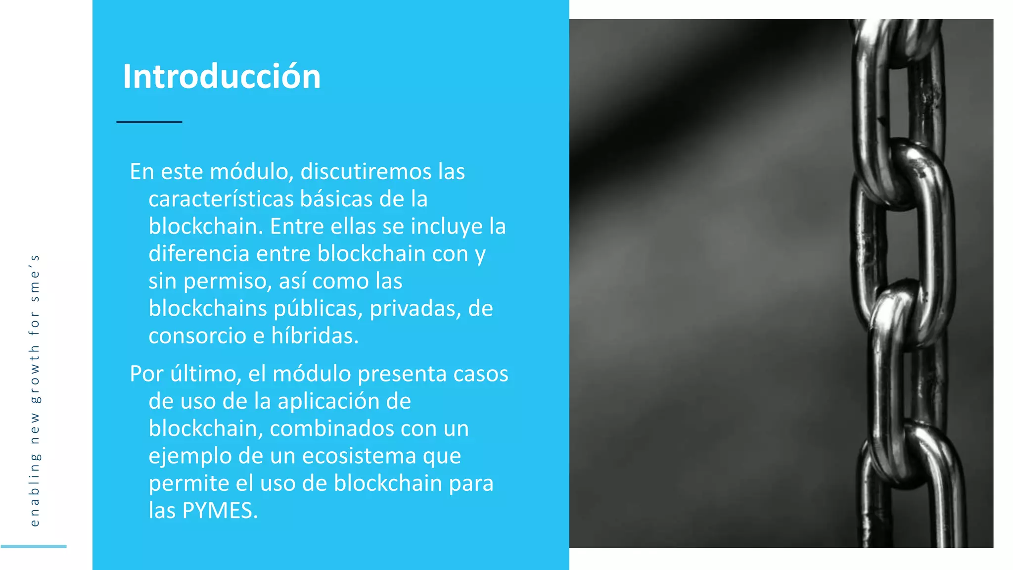 Este documento discute el potencial de la tecnología blockchain para las pequeñas y medianas empresas (PYMES). Explica los diferentes tipos de blockchain, incluidas las blockchains públicas, privadas, de consorcio e híbridas. Luego presenta casos de uso de blockchain en varias industrias, como el reciclaje, la cadena de suministro y la distribución de contenidos, y cómo puede mejorar la transparencia y la trazabilidad.