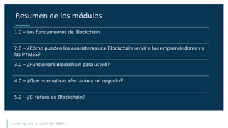 El documento presenta un curso sobre blockchain y su impacto en los negocios y pymes, abarcando sus fundamentos, aplicaciones actuales y futuras, así como beneficios y desafíos. Destaca la importancia de la sostenibilidad, la protección de datos, la interoperabilidad y el ciberespacio en la implementación de blockchain. También se exploran conceptos emergentes como las DAOs y el metaverso, sugiriendo que blockchain puede revolucionar las transacciones y la organización empresarial.