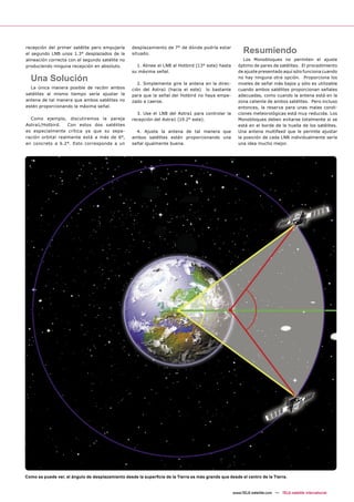 El documento explica que los monobloques no permiten un ajuste óptimo de pares de satélites debido a que el desplazamiento fijo entre los LNB no coincide con la separación real entre satélites cuando se observan desde la Tierra. Se propone un procedimiento de ajuste que proporciona señales débiles de ambos satélites al mismo tiempo, pero solo funciona en algunas zonas y condiciones. Se recomienda evitar monobloques si los satélites están cerca del borde de cobertura y usar una antena con ajuste independ