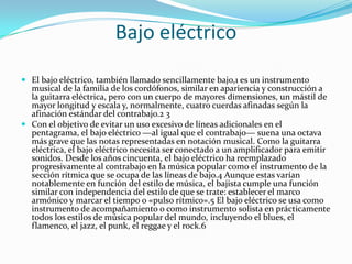 El documento describe la historia y características del bajo eléctrico. Comenzó siendo desarrollado en la década de 1930 pero no tuvo éxito comercial hasta que Leo Fender lanzó el Precision Bass en 1951, estableciéndose como el estándar de la industria. Desde entonces, ha sido usado en una variedad de géneros musicales y ha evolucionado con nuevos diseños, materiales y características electrónicas. Actualmente existen muchas opciones disponibles tanto de fabricantes comerciales como artesanales.