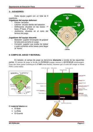 Este documento describe las reglas básicas del beisbol. Explica que el objetivo del equipo atacante es anotar carreras golpeando la pelota dentro del campo y corriendo alrededor de las bases, mientras que el objetivo del equipo defensor es eliminar bateadores y corredores para evitar carreras. Un partido dura 9 entradas y gana el equipo con más carreras al final. Cada equipo tiene 9 jugadores, incluidos lanzador, receptor y jugadores en las bases para la defensa, y bateador y corredores