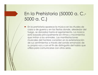 La música ha estado presente desde la prehistoria, cuando se usaba principalmente en rituales y danzas alrededor de fuegos. El origen de la palabra "música" proviene del griego antiguo y se refiere a las Musas, personajes femeninos que inspiraban a los artistas. Aunque hay múltiples definiciones de música debido a factores culturales e históricos, involucra elementos como la melodía, armonía, métrica y ritmo, así como parámetros del sonido como la altura, duración, intensidad