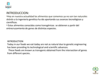 Este documento trata sobre los alimentos transgénicos. Explica que los alimentos transgénicos se obtienen mediante el entrecruzamiento de genes de diferentes especies usando ingeniería genética. También describe que la agrobiotecnología tiene como objetivo crear cultivos resistentes y más nutritivos. Finalmente, concluye que los alimentos transgénicos podrían ser beneficiosos si son desarrollados de manera responsable y sometidos a pruebas, pero también podrían afectar a la salud y el medio