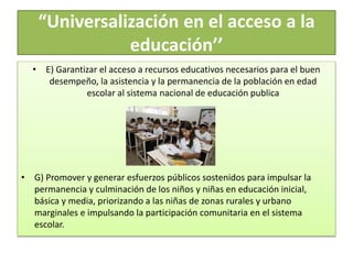 Este documento propone cuatro objetivos para fortalecer las capacidades de la ciudadanía a través de la educación: 1) garantizar el acceso a la educación, 2) mejorar la calidad de la educación, 3) potenciar el rol de los docentes, y 4) fomentar la interacción entre la educación, el sector productivo e investigación. Para cada objetivo, se enumeran varias estrategias como proporcionar recursos educativos, mejorar los estándares de calidad, actualizar conocimientos de docentes, e impulsar la formación de talent