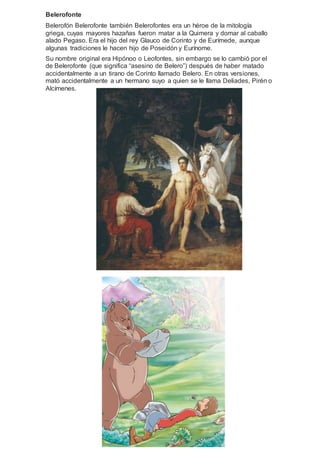 Belerofonte era un héroe griego conocido por matar a la Quimera y domar al caballo alado Pegaso. Era hijo del rey Glauco de Corinto, aunque algunas versiones dicen que era hijo de Poseidón. Originalmente se llamaba Hipónoo o Leofontes, pero su nombre fue cambiado a Belerofonte después de matar accidentalmente a un tirano de Corinto llamado Belero.