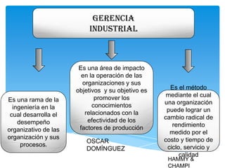 Este documento trata sobre la gerencia industrial. La gerencia industrial es una rama de la ingeniería que se enfoca en mejorar el desempeño organizacional y los procesos productivos de una empresa. Su objetivo principal es promover el conocimiento para mejorar la efectividad de los factores de producción y lograr cambios radicales en costos, tiempos de ciclo, servicio y calidad. La gerencia industrial se aplica comúnmente en industrias de equipos, industrias pesadas y manufactureras.