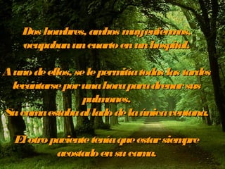 Dos hombres enfermos compartían una habitación en un hospital. Uno de ellos podía levantarse cada tarde para drenar sus pulmones y describía lo que veía fuera de la ventana a su compañero, quien era ciego. A pesar de no poder ver, el segundo hombre disfrutaba escuchar las descripciones. Cuando el primer hombre falleció, el segundo pidió ser trasladado a la cama junto a la ventana, sólo para descubrir que enfrente había una pared vacía.