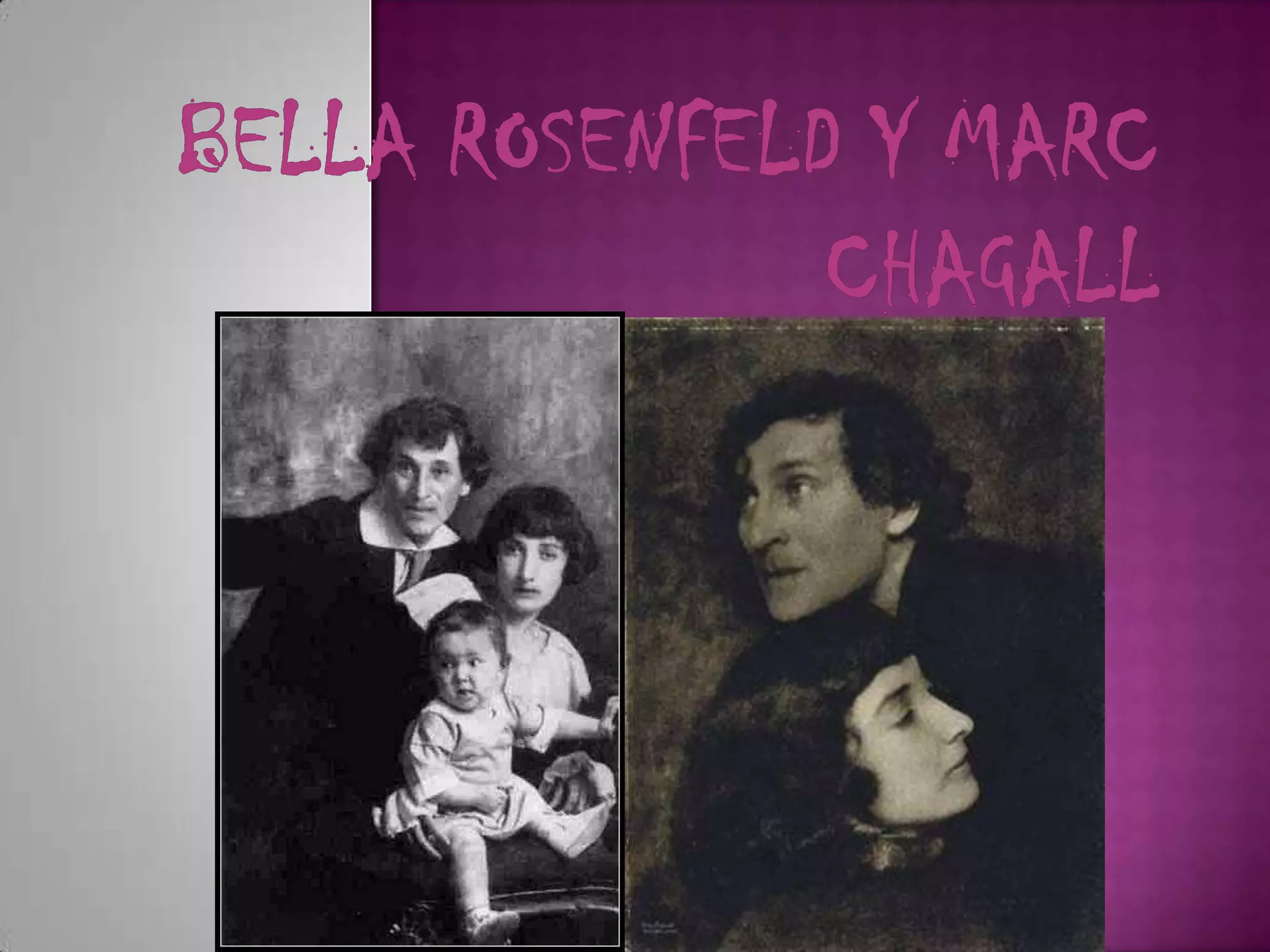 Bella Rosenfeld fue una escritora rusa y esposa del pintor Marc Chagall, a quien conoció en 1909 y se casaron en 1915. Se mudaron a Francia en 1922 y luego a Estados Unidos para escapar de la Segunda Guerra Mundial, donde Bella murió en 1941. Chagall publicó su libro más célebre Las luces iluminadas en 1946, en el que Bella organiza sus recuerdos según el calendario judío y pone la experiencia femenina en el centro de la narrativa. Marc Chagall fue un importante artista surreal