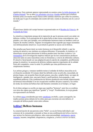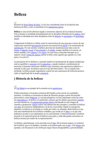 Este documento explora el concepto de belleza desde diferentes perspectivas. Define la belleza como aquello que agrada a los sentidos y provoca placer, y discute cómo la percepción de la belleza depende de factores culturales e individuales. También analiza la historia del concepto de belleza y cómo ha sido entendido por filósofos griegos como Platón, y examina los estándares de belleza física en diferentes culturas y épocas.