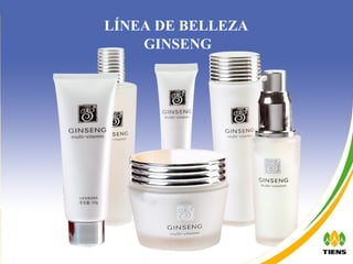La línea de belleza Ginseng utiliza extracto de la planta Panax Ginseng para ofrecer productos cosméticos que combaten el envejecimiento y mejoran la hidratación y elasticidad de la piel. Incluye una variedad de cremas, lociones y cápsulas que nutren y revitalizan la piel, así como champús y jabones con beneficios específicos para el cabello y la piel. La fórmula está basada en 5000 años de medicina tradicional china y combina ingredientes naturales con tecnología moderna.