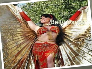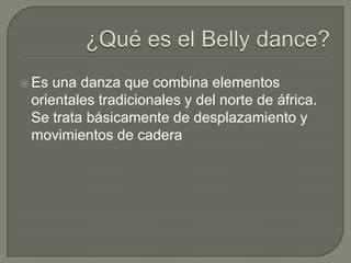 El belly dance es una danza que combina elementos orientales y del norte de África que se centra en los movimientos de la cadera. Tradicionalmente se practica con accesorios como velos y bastones. Además de ser una danza principalmente femenina, ofrece beneficios para la salud como mejorar la postura, fortalecer los músculos y reducir el estrés.