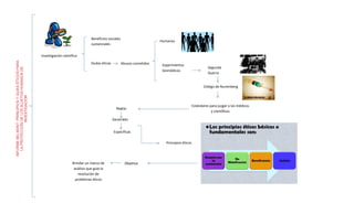 Este documento resume los principios éticos establecidos en la Declaración de Belmont para la protección de los sujetos humanos de investigación. Los tres principios centrales son el respeto a las personas a través del consentimiento informado, la beneficencia mediante una evaluación favorable de riesgos y beneficios, y la justicia en la selección equitativa de los sujetos. El documento también analiza conceptos como autonomía, no maleficencia, y justicia distributiva en el contexto de la investigación con seres humanos.