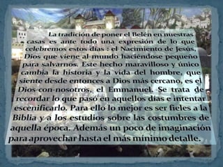 El documento presenta un belén que incluye símbolos como la Biblia, velas y una corona de Adviento. Describe la casa de María y José en Nazaret y la aparición del ángel a José. Relata el nacimiento de Jesús en un pesebre en Belén y la visita de los pastores y magos. También menciona la huida a Egipto para escapar de Herodes.