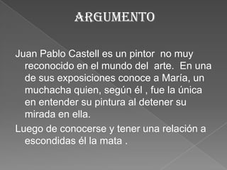 Juan Pablo Castell es un pintor poco reconocido que conoce a María en una exposición. Ella es la única que entiende su pintura. Luego de tener una relación secreta, Juan Pablo mata a María en un ataque de celos porque cree que ella tiene otras relaciones a escondidas de su esposo ciego. Horas después se entrega a la justicia y confiesa haber matado a la única persona que lo comprendió.