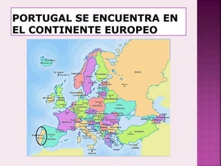 Portugal tiene 7 castillos, su idioma es el portugués y su capital es Lisboa, ubicada en un estuario donde desemboca el río Tajo en el océano Atlántico. Portugal tiene alrededor de 10 millones de habitantes de diversas razas y regiones como Oporto, donde se produce el famoso vino portugués. Algunas características típicas de Portugal incluyen el bacalao, el café, la repostería dulce y el fado como música tradicional, mientras que deportes populares son el fútbol y