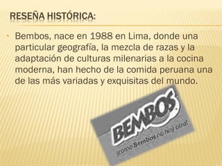 Bembos es una cadena de restaurantes peruana fundada en 1988 en Lima. Ofrecen hamburguesas a la parrilla hechas con carne de novillo y sazonadas con especias de la cocina peruana. Se diferencian por cocinar las hamburguesas a la parrilla de carbón para darles un sabor único.