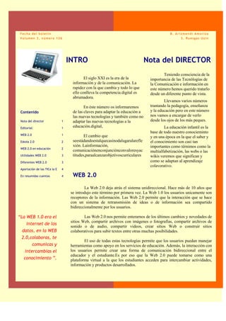 El documento trata sobre el uso de las tecnologías de la información y la comunicación (TIC) en la educación infantil. Explica que la Web 2.0 permite la colaboración y el intercambio de conocimiento entre usuarios de forma bidireccional. También describe el programa Eskola 2.0 en el País Vasco, el cual incorpora las TIC en las aulas a través de equipamiento, formación del profesorado y contenidos multimedia. Finalmente, resalta que las TIC en educación facilitan un aprendizaje más completo y la comunicación,