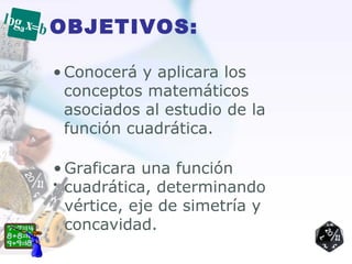 El documento presenta información sobre las funciones cuadráticas y ecuaciones de segundo grado. Explica conceptos clave como vértice, eje de simetría, concavidad y coeficientes. También muestra ejemplos de cómo calcular el vértice y eje de simetría a partir de la ecuación de una parábola.