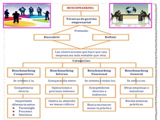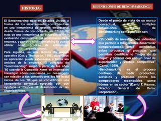 El documento proporciona una visión general sobre el benchmarking, su evolución y definición como herramienta de gestión empresarial que permite la autoevaluación y la comparación del desempeño organizacional. Destaca sus ventajas, tipos (interno, externo, competitivo, genérico, funcional) y las fases del proceso de benchmarking, que van desde la preparación hasta el seguimiento de resultados. También se subraya su utilidad en la identificación de mejores prácticas y en la mejora continua de procesos para alcanzar la ventaja competitiva.
