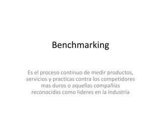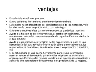 El benchmarking es el proceso continuo de medir productos, servicios y prácticas de una organización contra los competidores u organizaciones líderes en la industria para identificar áreas de mejora. Proporciona ventajas como mejorar procesos, fijar objetivos y aprender de otras empresas, pero también tiene desventajas como el alto costo y tiempo requerido. Existen diferentes tipos de benchmarking como el interno, competitivo y funcional.