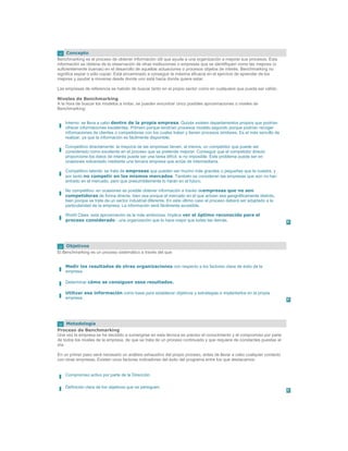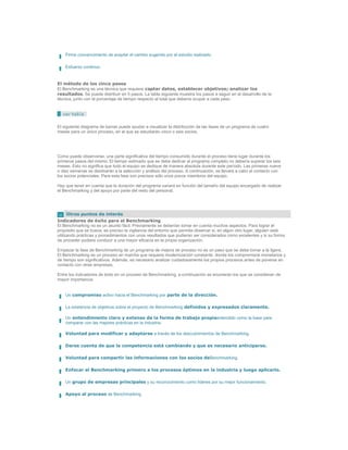 El documento habla sobre el concepto de benchmarking, que es el proceso de obtener información de otras organizaciones líderes para mejorar los propios procesos. Describe cinco niveles de benchmarking, desde interno hasta mundial. Explica que el objetivo es medir resultados de otros, determinar cómo los lograron y usar esa información para establecer objetivos y estrategias. Finalmente, detalla los pasos del proceso de benchmarking y los indicadores clave para tener éxito, como el compromiso de la dirección y la voluntad de cambiar basado en los hallaz