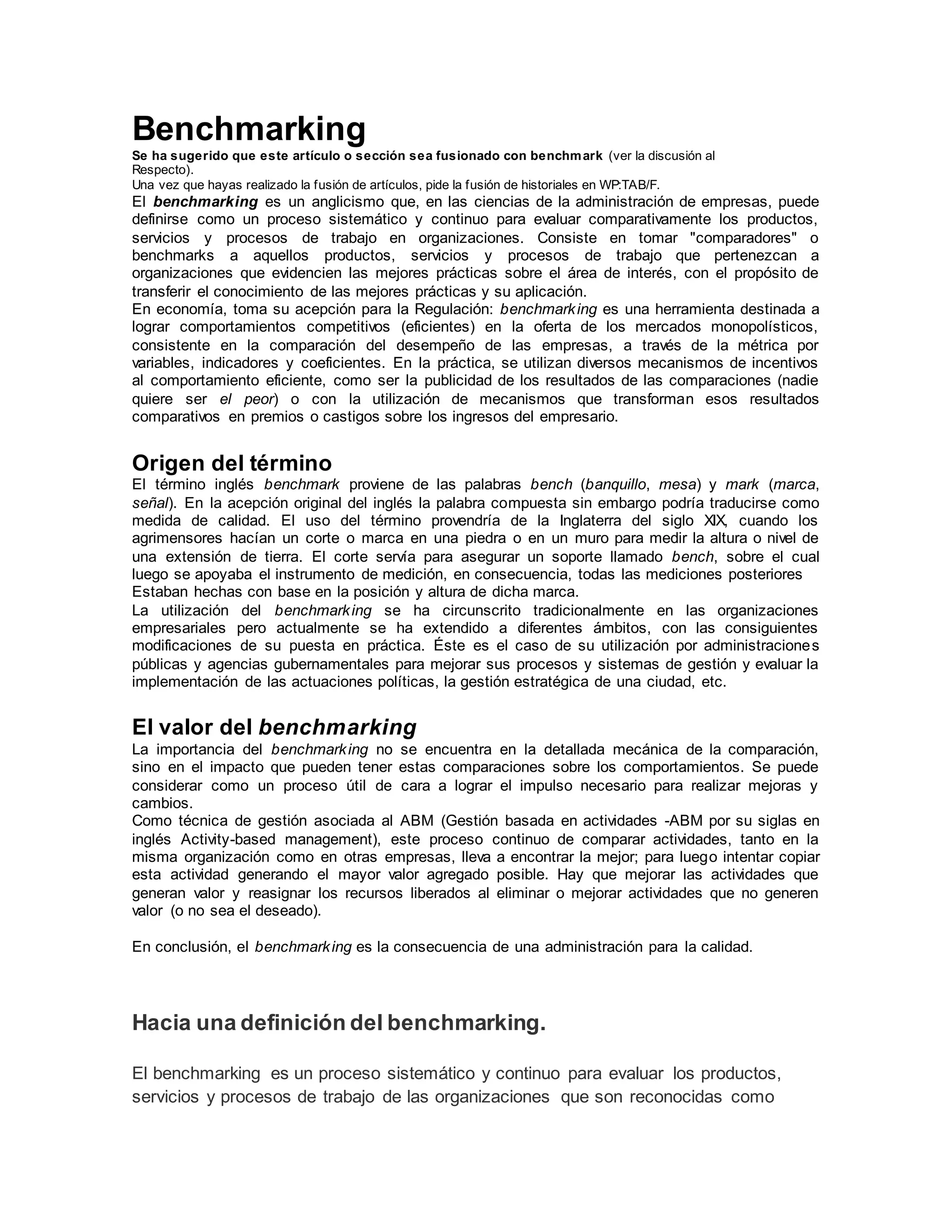 El benchmarking es un proceso sistemático y continuo para evaluar comparativamente los productos, servicios y procesos de trabajo de organizaciones reconocidas por sus mejores prácticas, con el objetivo de realizar mejoras organizacionales. Existen tres tipos principales de benchmarking: interno, competitivo y funcional (genérico). El benchmarking es una herramienta útil para la planificación estratégica, pronósticos, identificación de nuevas ideas y fijación de objetivos. Cualquier aspecto de una organización que pueda medirse puede someter