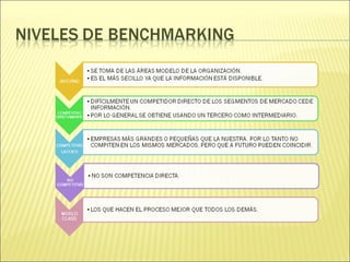 Este documento presenta información sobre varios temas de mercadotecnia como benchmarking, marketing en puntos de venta, gestión de marcas y capital de marca. Explica que el benchmarking es el proceso de obtener información de otras organizaciones para mejorar procesos propios. También describe técnicas de marketing en puntos de venta para estimular las ventas de productos más rentables e impulsivas. Finalmente, define la gestión de marcas como la creación y administración de activos duraderos para las empresas más allá de campañas, y cómo medir el