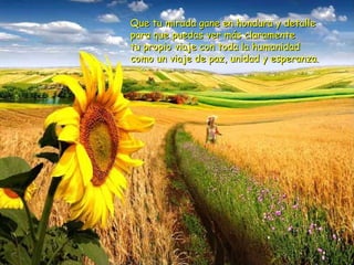 El documento presenta una bendición para el año nuevo compuesta por 12 oraciones. La bendición desea que en el nuevo año la persona pueda ver su viaje y el de la humanidad con mayor profundidad y detalle como un viaje de paz, unidad y esperanza; que sea consciente de los lugares por los que camina; que dé la bienvenida a los demás con una sonrisa; que disfrute de la creación y cuide la tierra; que sienta compasión por los demás; que despierte agradecido cada día; que su espíritu esté
