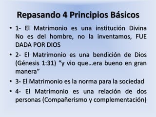 Este documento describe las bendiciones del matrimonio cristiano según la Biblia. Resalta que el matrimonio es una institución divina establecida por Dios para que los esposos no estén solos y se apoyen mutuamente. También trae los frutos de amor permanente a través de la familia y los hijos, lo cual constituye una gran bendición. El matrimonio bíblico muestra el amor de Cristo por su iglesia y trae paz y seguridad a quienes se comprometen con este llamado divino
