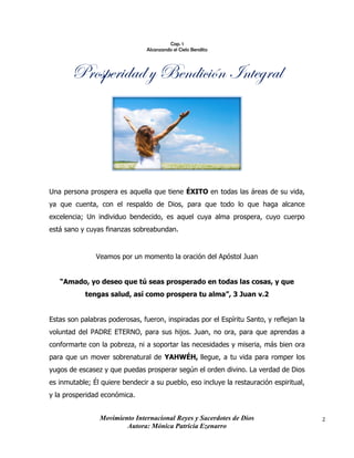 Este documento habla sobre alcanzar la prosperidad y bendición integral a través de una relación con Dios. Explica que Dios quiere que sus hijos prosperen en todas las áreas de su vida, incluyendo lo espiritual, físico y económico. También discute cómo pensamientos negativos pueden impedir la bendición de Dios y la necesidad de renovar la mente. Finalmente, enfatiza que Dios se alegra de la prosperidad de sus hijos y que la falta de fidelidad a Él es lo que causa pobreza en el mundo.