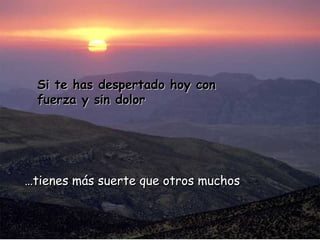 El documento describe varias formas en las que las personas tienen suerte en comparación con otros en el mundo. Si una persona se ha despertado sin dolor, tiene más suerte que los que conocen la guerra, la prisión o el hambre. Si una persona puede practicar su religión sin persecución, tiene más suerte que los 3 millones que no pueden. Si una persona tiene sus necesidades básicas cubiertas, es más rica que el 75% de la población mundial.