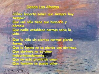 Este documento presenta información biográfica del escritor, poeta y ensayista uruguayo Mario Orlando Hamlet Hardy Brenno Benedetti Farugia, nacido en 1920 y fallecido en 2009. Incluye detalles sobre su fecha de nacimiento, lugar de nacimiento, ocupación y los movimientos literarios a los que perteneció. Además, presenta un poema suyo titulado "Desde Los Afectos" compuesto por varios párrafos reflexivos sobre temas como el amor, la vida, la muerte y las relaciones human