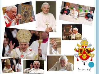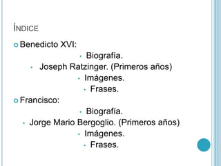 Este documento presenta información biográfica sobre los papas Benedicto XVI y Francisco. Describe los primeros años, educación y carrera eclesiástica de ambos antes de convertirse en papas. También incluye algunas de sus frases más destacadas.