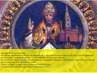 El Papa Benedicto XVI introduce el nuevo ciclo de catequesis para el Año de la Fe, con el objetivo de renovar el entusiasmo por creer en Jesucristo, reavivar la alegría de seguir su camino, y testimoniar la fuerza transformadora de la fe. El Papa destaca la importancia de volver a Dios, profundizar la propia fe, y fortalecer la pertenencia a la Iglesia. Asimismo, enfatiza que la fe involucra la vida total y transforma todo en el creyente.
