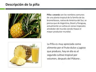 La piña es una planta tropical originaria de América del Sur cultivada en zonas tropicales alrededor del mundo. Es apreciada por su fruto dulce y jugoso. Sus beneficios incluyen mejorar la circulación y la digestión, así como ayudar con desórdenes estomacales, obesidad y retención de líquidos.