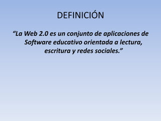 La Web 2.0 ofrece beneficios educativos como herramientas para la lectura, escritura y redes sociales que permiten un aprendizaje constructivo donde los roles del profesor y estudiante evolucionan. Estas herramientas incluyen wikis, blogs, y redes sociales que facilitan la creación y compartición de contenido educativo.