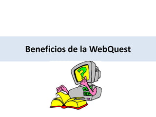 Las webquests son actividades didácticas que impulsan la investigación guiada a través de internet, fomentando habilidades cognitivas superiores, trabajo en equipo y autonomía en los estudiantes. Su correcta implementación puede aumentar la motivación del alumno y promover el aprendizaje a través de la resolución de problemas y el pensamiento crítico. Se fundamentan en modelos teóricos como el constructivismo y el aprendizaje colaborativo, transformando la enseñanza en un proceso donde el docente actúa como mediador en lugar de ser la única fuente de conocimiento.
