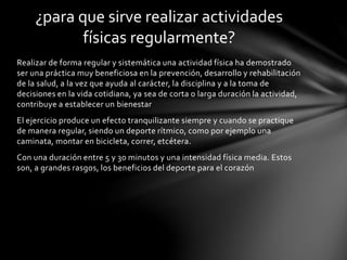 Realizar actividades físicas de forma regular ofrece múltiples beneficios para la salud, incluyendo mejora en la condición física, regulación de la presión arterial y aumento de la autoestima. Además, la actividad física ayuda a reducir el estrés y la depresión, promoviendo un bienestar general. Es importante consultar a un médico en caso de enfermedades crónicas o lesiones antes de comenzar un régimen de ejercicios.