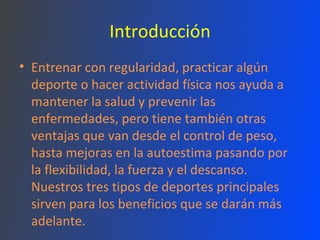 El documento describe 10 beneficios de practicar deporte regularmente, incluyendo mantener un peso saludable, fortalecer los huesos, reducir el riesgo de enfermedades como la presión arterial alta y el cáncer, aumentar la resistencia y energía, fortalecer los músculos, mejorar el estado de ánimo, reducir el estrés y mejorar el sueño, aumentar la flexibilidad y coordinación, reducir las lesiones, y sentirse más joven. Se recomienda un mínimo de 3 horas semanales de ejercicio, con