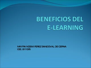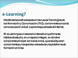 El documento habla sobre el e-Learning o aprendizaje en línea, definido como una modalidad educativa basada en las tecnologías de la información que permite aprender de forma interactiva a través de Internet. Explica que el e-Learning fomenta hábitos de estudio en un espacio integral centrado en el alumno, y permite adquirir conocimientos de forma personalizada con menor costo. También discute factores clave para el éxito como una adecuada estrategia, contenidos de calidad, entorno tecnológico y tutoría