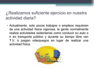 El documento describe los beneficios del ejercicio físico regular para la salud, como controlar el peso, prevenir enfermedades y mejorar el estado de ánimo. Recomienda realizar de 30 a 60 minutos de actividad aeróbica de intensidad moderada varios días a la semana, así como ejercicios de resistencia 2 o 3 veces por semana. Además, ofrece consejos para incorporar el ejercicio como un hábito en la vida diaria y abordar posibles obstáculos como la falta de tiempo.