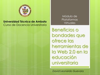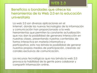 La Web 2.0 ofrece herramientas que permiten la interacción y actualización constante en las clases universitarias, facilitando la generación y compartición de contenidos de forma participativa. Estas herramientas promueven la inteligencia colectiva, las contribuciones grupales, un sentido de comunidad y cultura de aprendizaje colaborativo. La aplicación de la Web 2.0 en la educación superior es fundamental para lograr una educación horizontal donde la generación y difusión del conocimiento sea más rápida y efectiva.